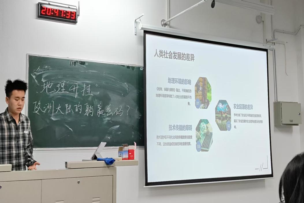 畅所欲言环节,同学们围绕“不同大陆的历史轨迹由环境与偶然性塑造,而非文明优劣。”这一观点展开激烈讨论。谷宁老师总结发言,他表示,地理曾被视为历史的骨骼,而当代年轻人将赋予文明新的面貌,最伟大的征服是开拓认知的边疆。他期望同学们保持对知识的渴望,不断探索未知,用知识和思考塑造未来。